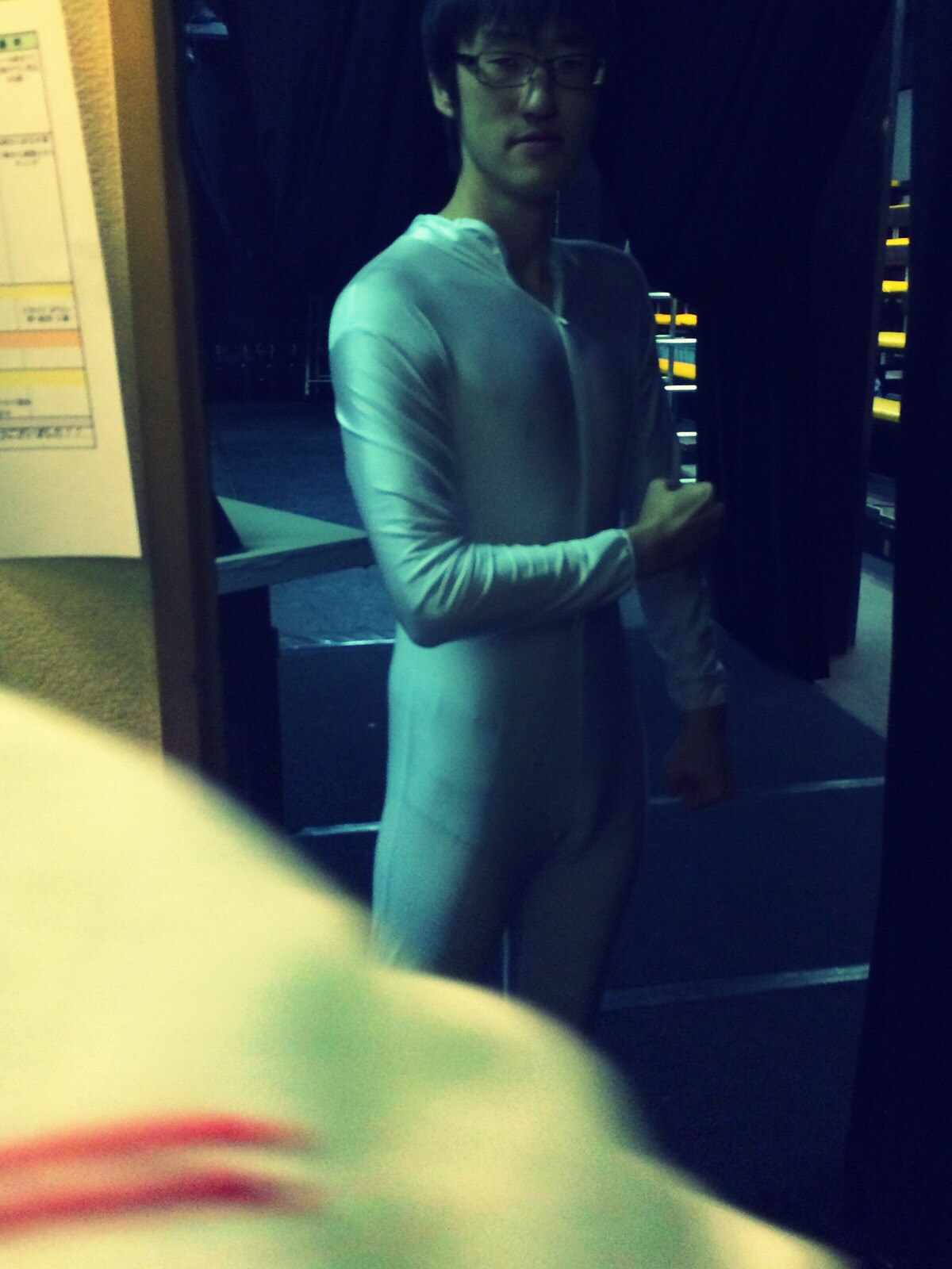 ▼本番で僕が着た全身タイツを着る中島。